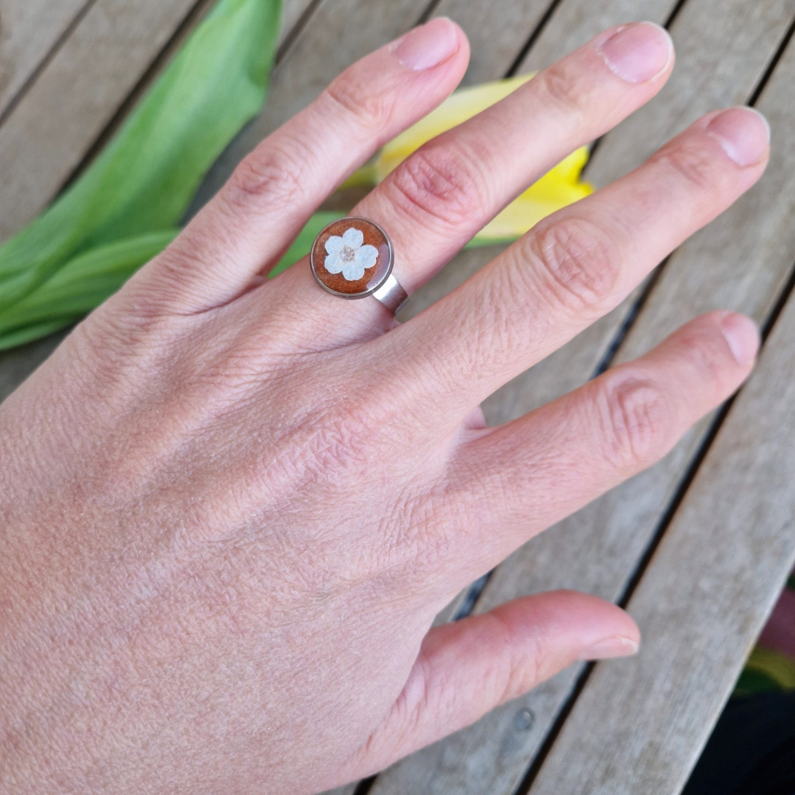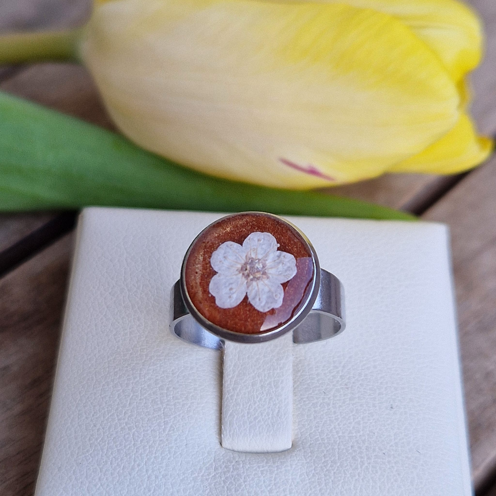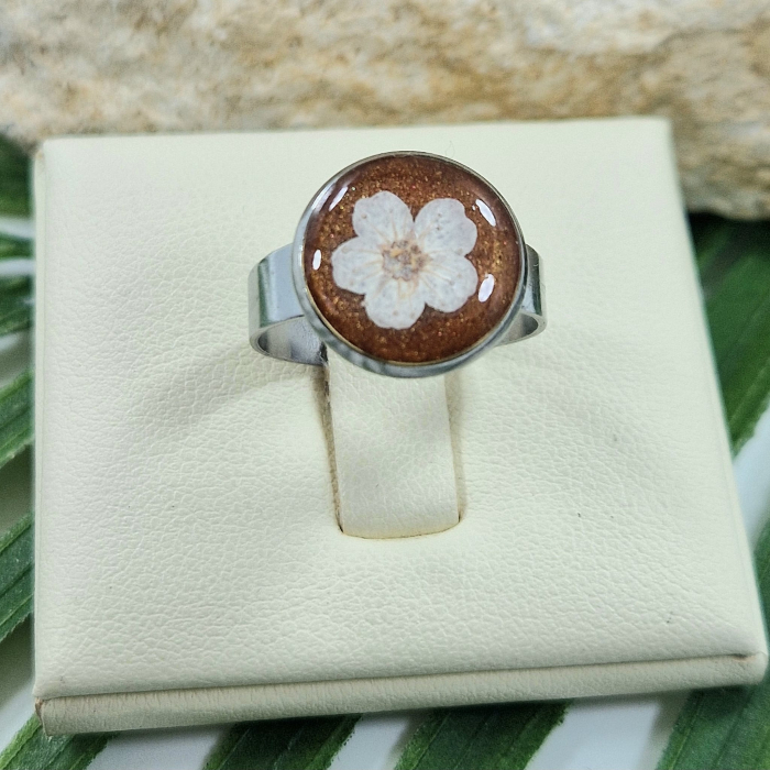 Aceast inel realizat manual îmbină farmecul naturii cu tehnologia modernă a rășinii, creând o bijuterie unică și fascinantă. Detaliile delicate ale floriilor  sunt protejate de rășina UV, care garantează că culorile vibrante și frumusețea naturală a florilor vor rămâne intacte. Oțelul inoxidabil asigură o purtare sigură și o durabilitate îndelungată.