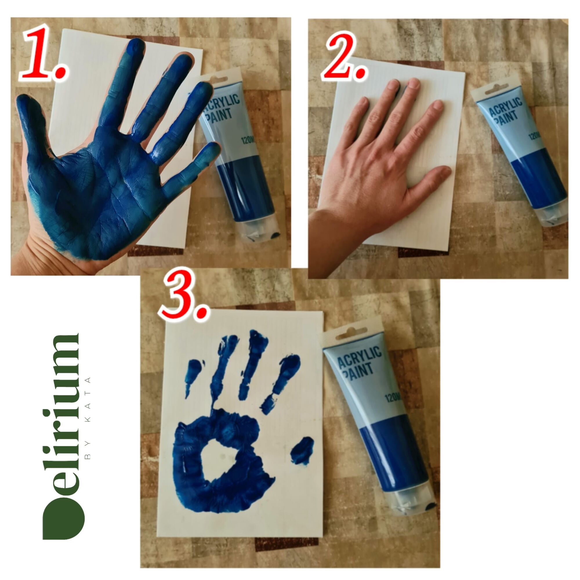 - Pentru a crea amprente de picior, mână sau lăbuță, aplică un strat uniform de vopsea acrilică pe talpă, deget sau lăbuță și apasă ferm pe o foaie de hârtie albă curată, fără a mișca amprenta.