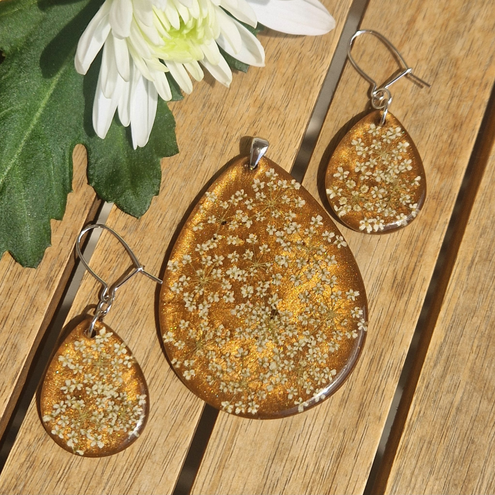 • Materiale utilizate: Rășină rezistentă la UV, flori de morcov, argint 925 – Materiale naturale, durabile și prietenoase cu pielea.