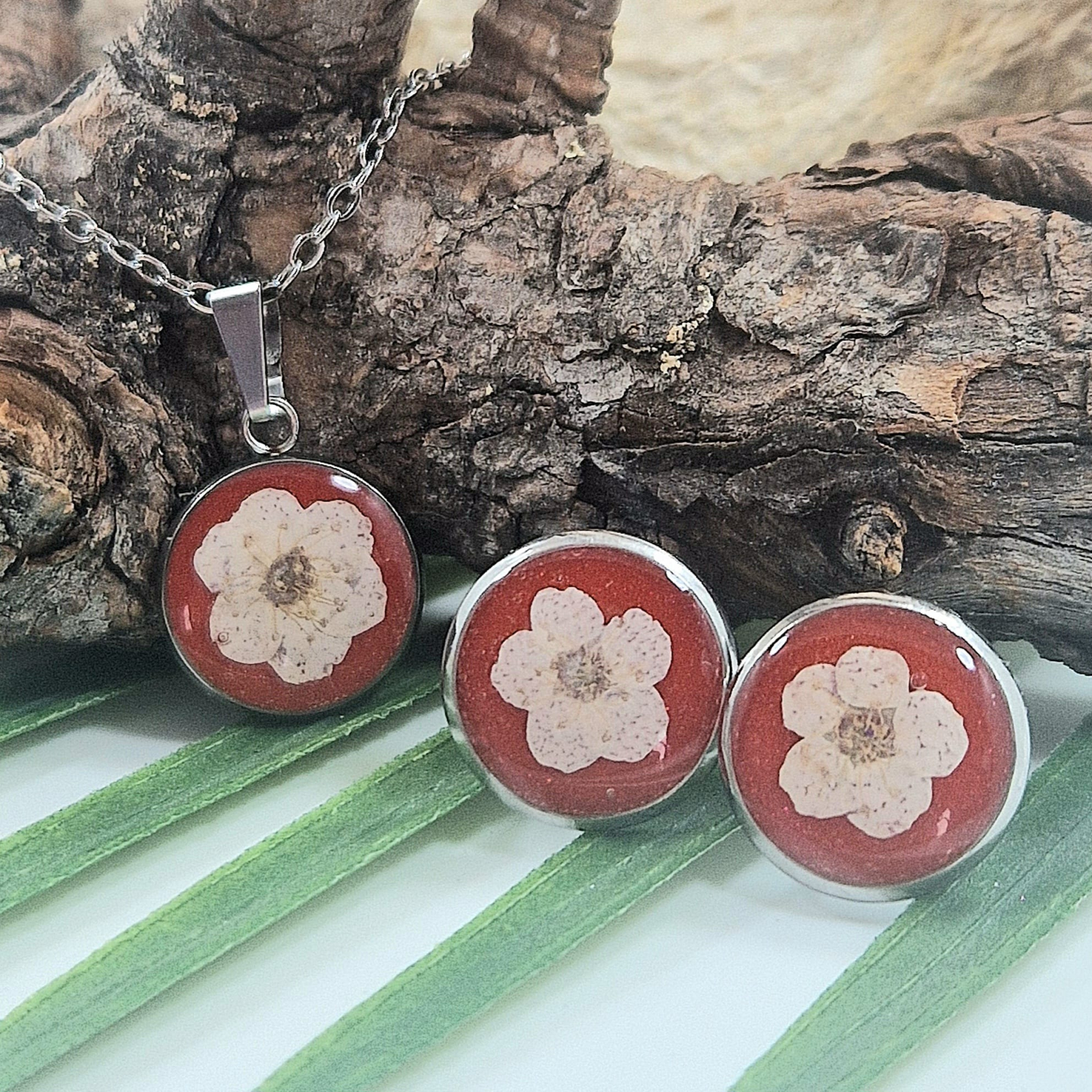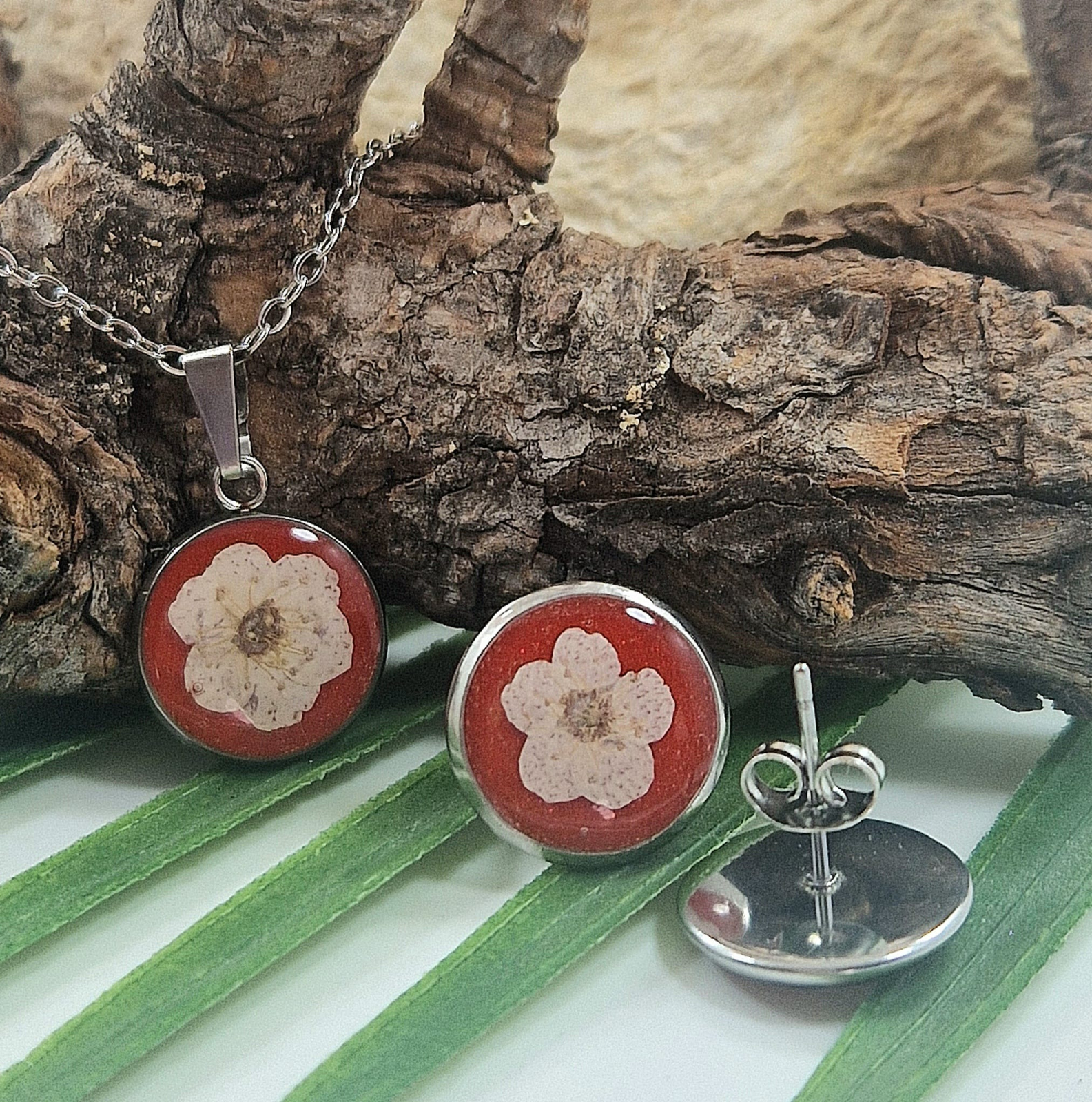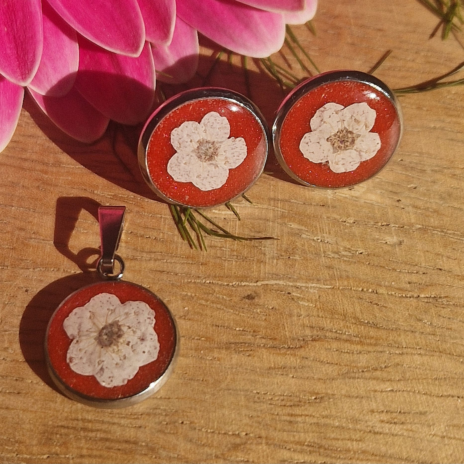 Acest set de bijuterii unic îmbină minunat frumusețea naturii cu designul modern. Setul include un pandantiv și cercei, confecționați din flori de câmp și rășină cristalină, rezistentă la UV.