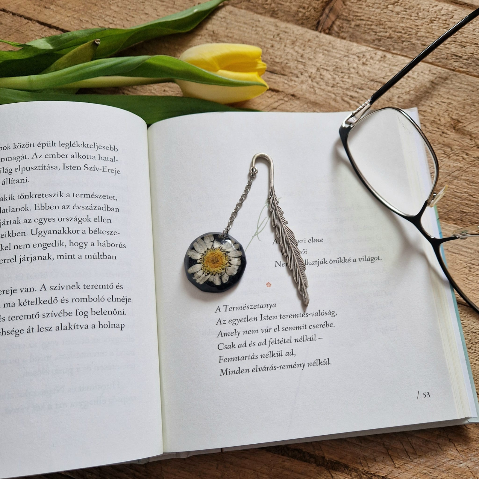 Acest semn de carte este unic, la fel ca elementele naturale din care este realizat. Rășina este cristalină, puternică și rezistentă la UV, garantând o durabilitate îndelungată. Materialul este ușor, dar nu fragil, oferind un efect asemănător sticlei, dar mult mai rezistent. Semnul de carte nu necesită întreținere și va fi un accesoriu durabil pentru toți iubitorii de lectură. Mai multe informații despre întreținere găsiți la secțiunea „Întreținerea și îngrijirea bijuteriilor și accesoriilor”.