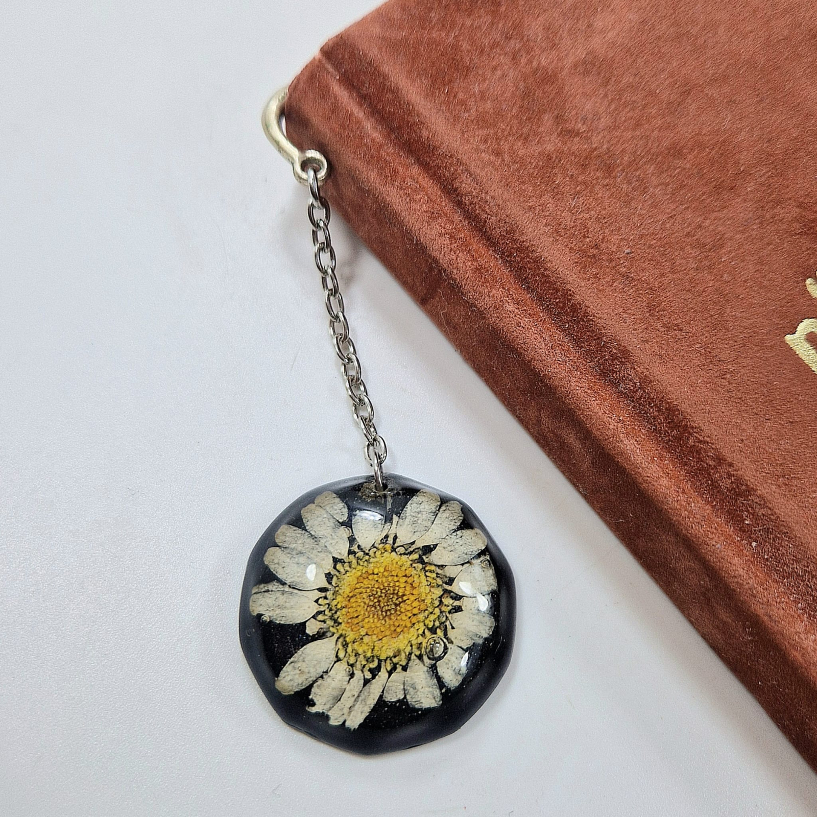 Partea superioară curbată din metal se agață de cotorul cărții, astfel încât să marchezi locul unde ai rămas cu cititul. Partea cu floare rămâne atârnată în afara cărții, adăugând un element decorativ delicat. Grosimea cărții nu influențează utilizarea semnului de carte, deoarece cotorul are aceeași dimensiune la orice punct al cărții.