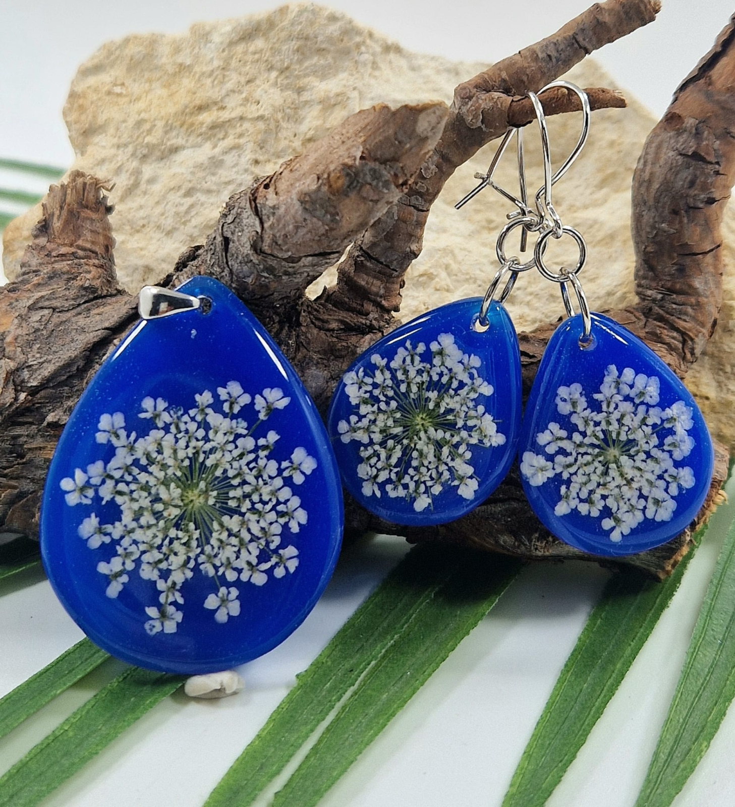Acest set de bijuterii unic îmbină minunat frumusețea naturii cu designul modern și eșegant. Setul include un pandantiv și cercei, confecționați din flori de câmp, argint 925 și rășină cristalină, rezistentă la UV.  Nuanțele naturale ale setului se potrivesc perfect cu detaliile din argint, oferindu-i un aspect rafinat și durabil. Ideal pentru purtarea de zi cu zi sau pentru ocazii speciale, acest set evidențiază stilul unic și apropierea de natură a celui care îl poartă.