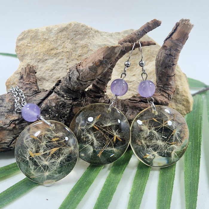 Acest set de bijuterii unic îmbină minunat frumusețea naturii cu designul modern. Setul include un pandantiv și cercei, confecționați din flori de câmp și rășină cristalină, rezistentă la UV.