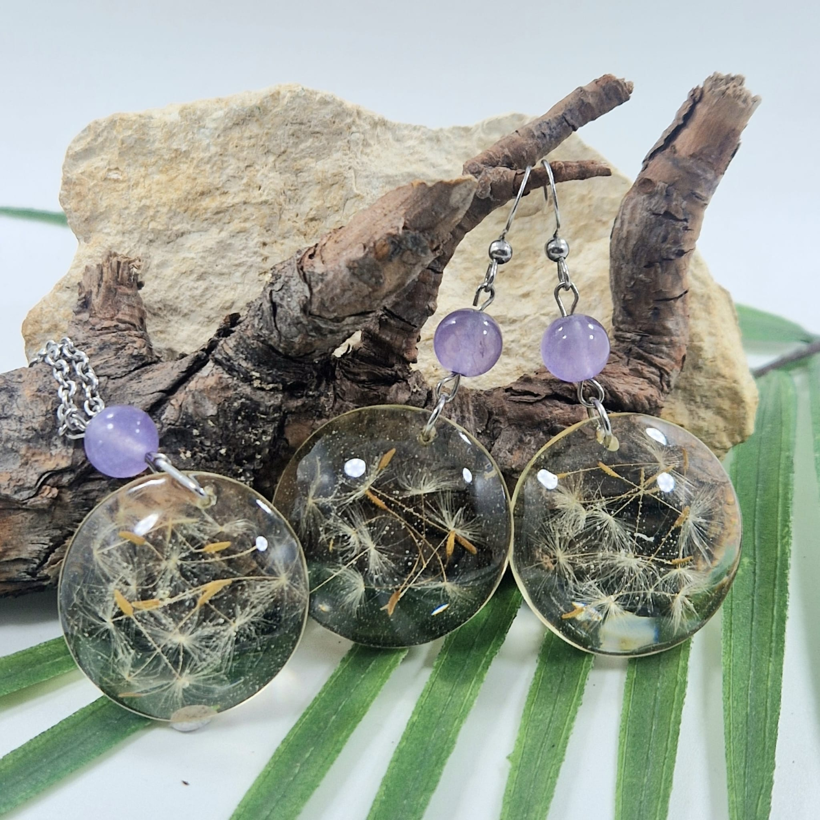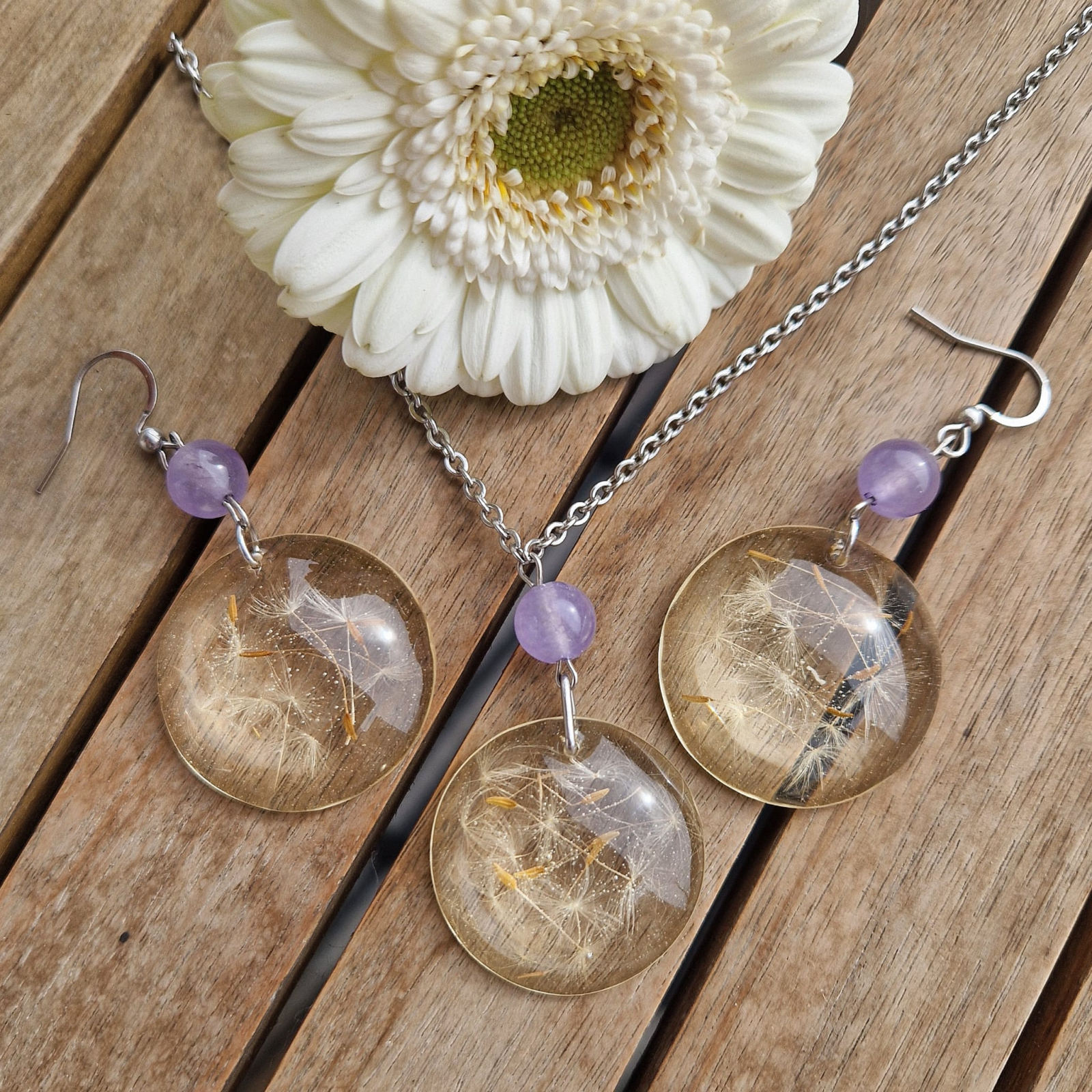 • Materiale utilizate: Rășină rezistentă la UV, păpădie, mărgele de sticlă, oțel inxidabil